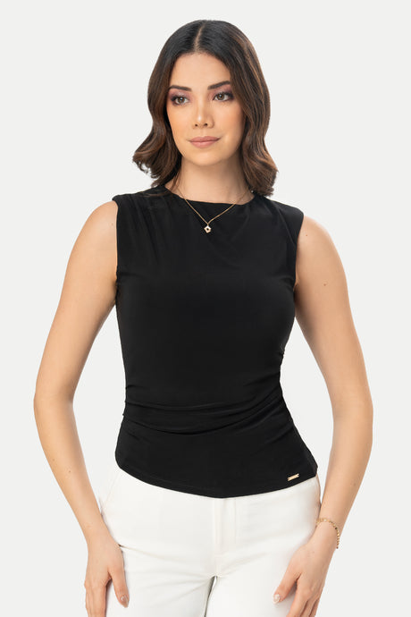 - Diseño sin mangas que estiliza brazos y hombros