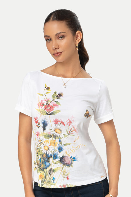 - Aplicación de estampado floral ilustrado en delantero