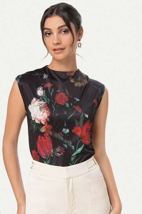 - Estampado floral de alto contraste sobre fondos oscuros