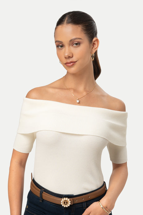 - Escote off shoulder con banda amplia que realza hombro y cuello