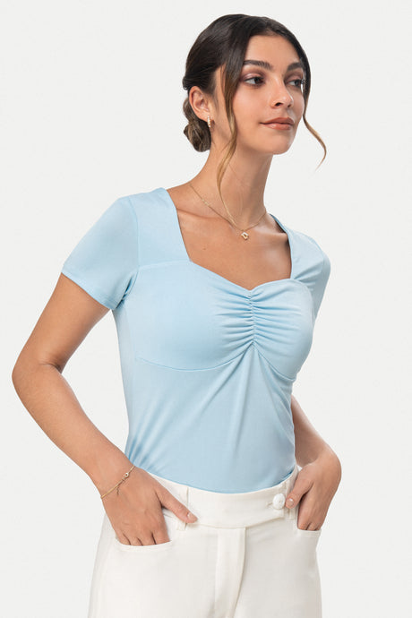 - Frunce central en el busto que aporta textura y efecto moldeador